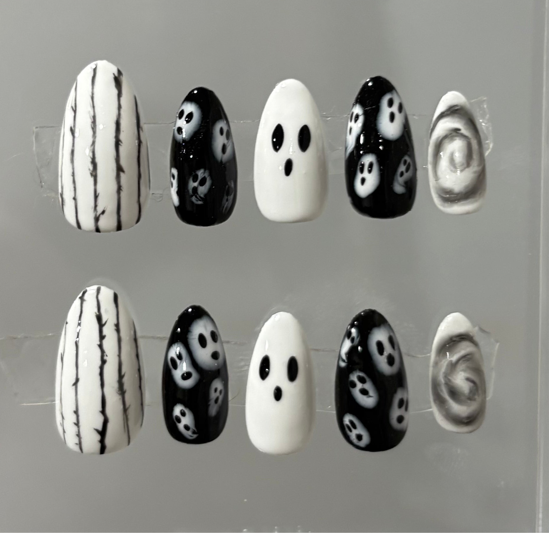 Ghost Press On Nails: 3D Gel Almond, Spooky Halloween Nail Art
